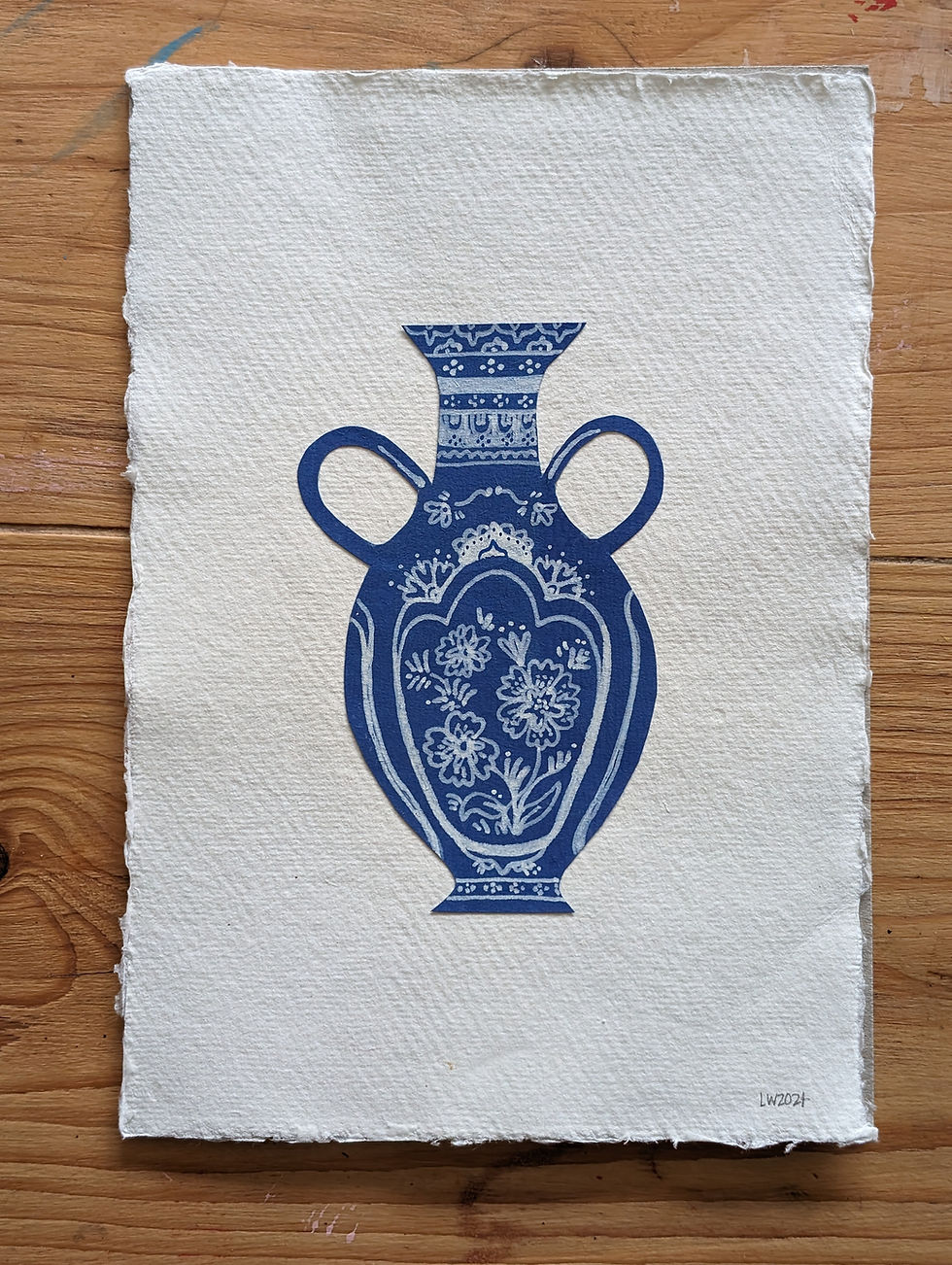 Her beautiful works on paper are made from paper collage, stained papers cut into delicate shapes inspired by Greek pottery, blue and white delftware and Staffordshire figurines. Laura’s work celebrates world culture, beautiful craftsmanship, history and British museums.