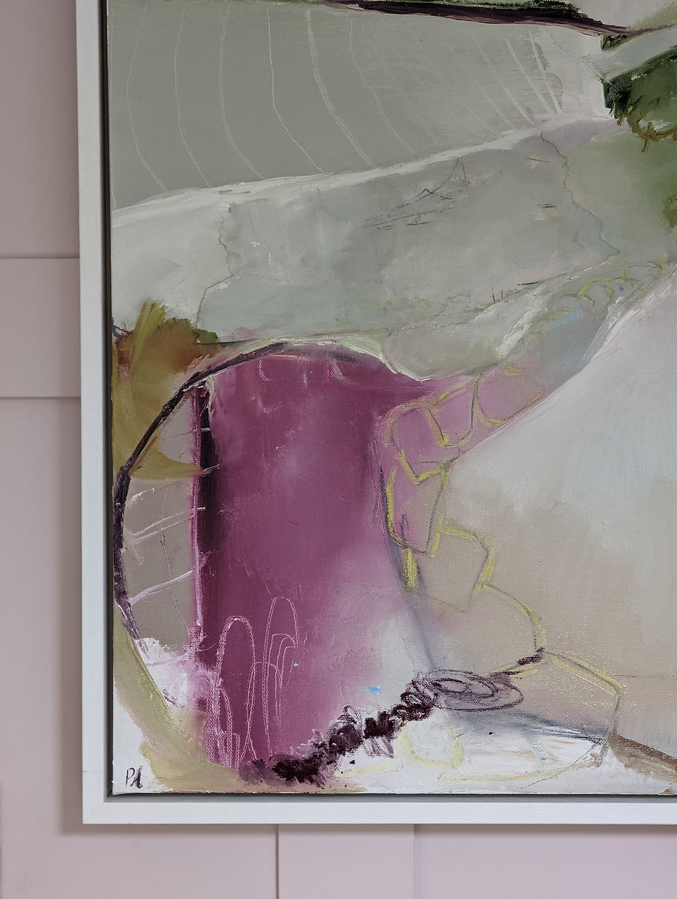 Polly is a fan of the Abstract Expressionist movement in mid twentieth century America and draws inspiration from artists of this period. She also enjoys the juxtaposition between a physical and expressive painting process and more contemplative elements of deep calm within a painting. She seeks to use both processes in her work and a painting will often begin in a very gestural way before gradually finding a resolution with softer, more considered marks.